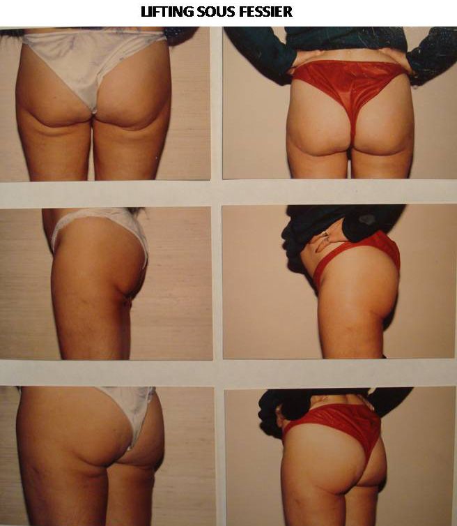Soit il existe seulement une détente de la partie inférieure de la fesse, avec bourrelets de son bord inférieur et de la face postérieur de la cuisse, juste au dessous du pli sous fessier, et on pratique alors un lifting de la partie inférieure de la fesse par une incision située sous le pli fessier ; on enroule à l’intérieur 2 fuseaux de peau désépidermisés ce qui retend fesses et cuisses et redonne du volume au bord inférieur de la fesse ; la cicatrice se situe dans le sillon sous fessier reconstitué.